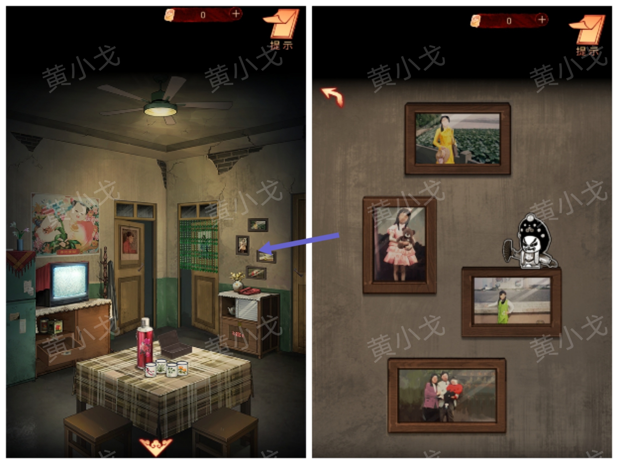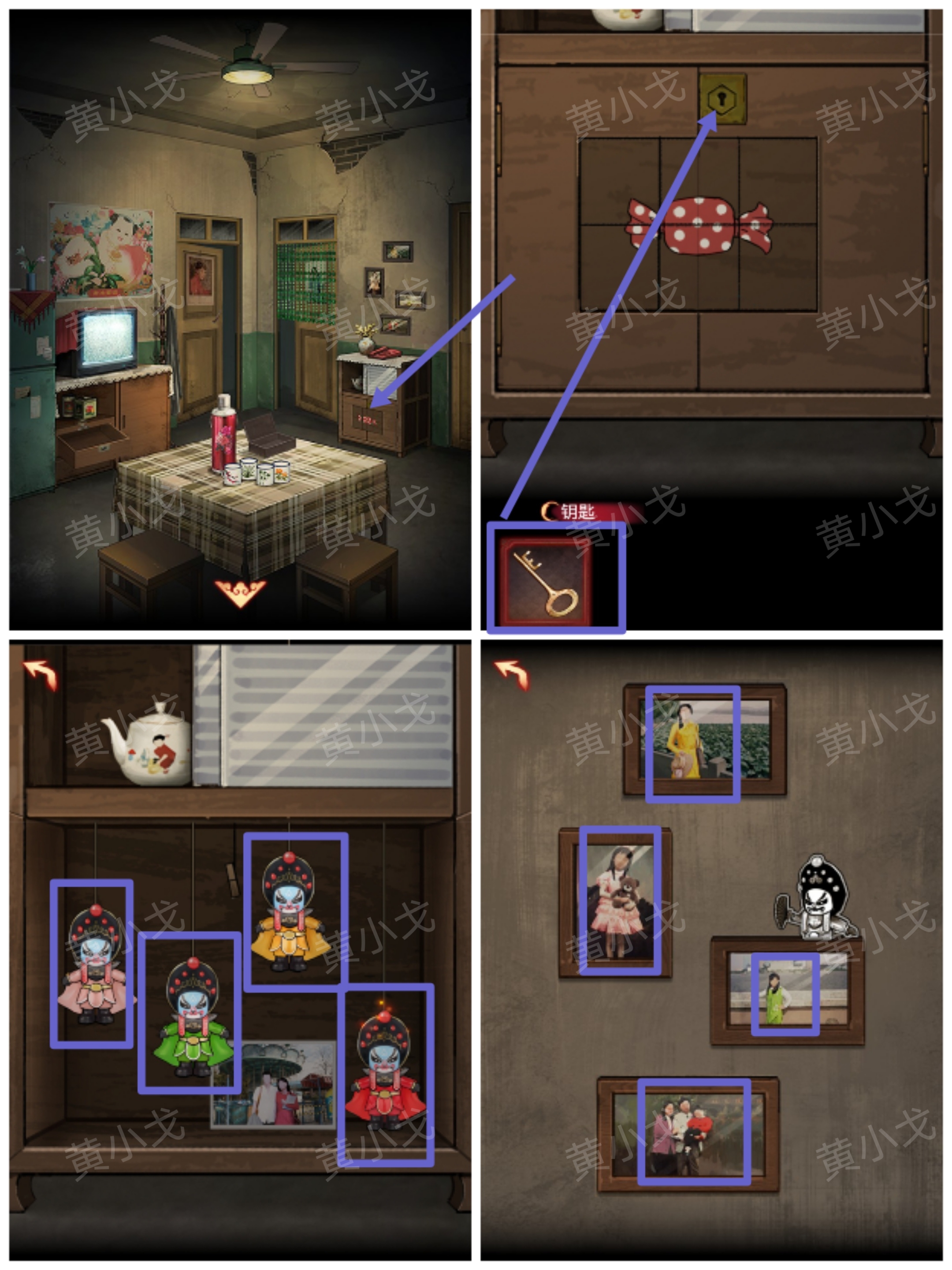 4.点击柜子,用【钥匙】打开;根据墙上的照片,结合皮影的衣服颜色,调整皮影至对应的高度
