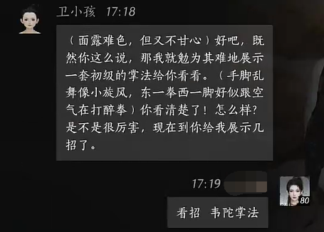 玩家第二句:“看招,韦陀掌法。” → 模仿卫小孩的掌法动作