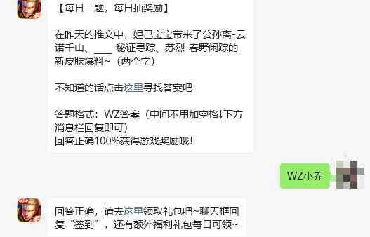 问题:在昨天的推文中,妲己宝宝带来了公孙离-云诺千山、____-秘证寻踪、苏烈-春野闲踪的新皮肤爆料(两个字)。