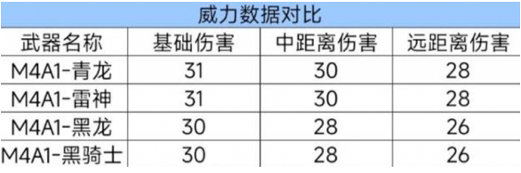 M4A1-青龙的基础伤害、中距离伤害及远距离伤害均与M4A1-雷神相同,且在各个距离上,其伤害均高于M4A1-黑龙和M4A1-黑骑士。这使得M4A1-青龙成为远程交火中的强大选择。