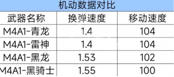 M4A1-青龙和M4A1-雷神拥有最快的换弹速度(1.4秒)和最高的移动速度(104),为战斗提供了极大的灵活性。M4A1-黑龙的换弹时间为1.53秒,移动速度为102。M4A1-黑骑士在这两方面表现最慢,分别为1.55秒和100。