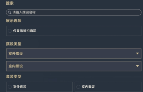 – 在摆设图纸分类中找到赠礼套装(蓝/红色标识区分室内外)5.2版本快捷筛选: